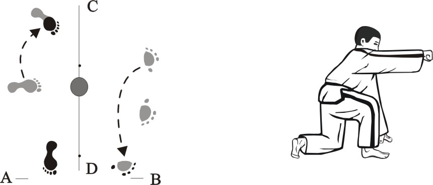 Turn right on the left knee, place the left foot towards C and the right foot towards D, and place the left arched hand on the ground towards D, form a right kneeling stance towards D and make a right fist-punch high.