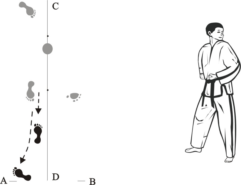 Turn right on the right foot and make a left front-kick middle towards C.