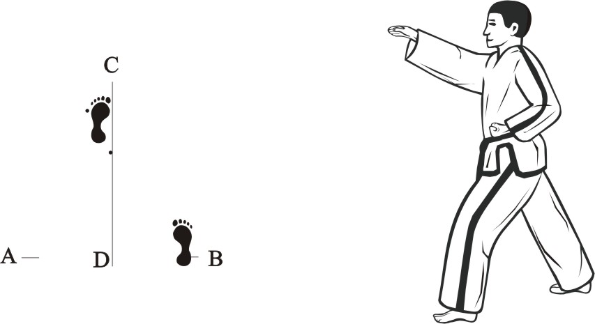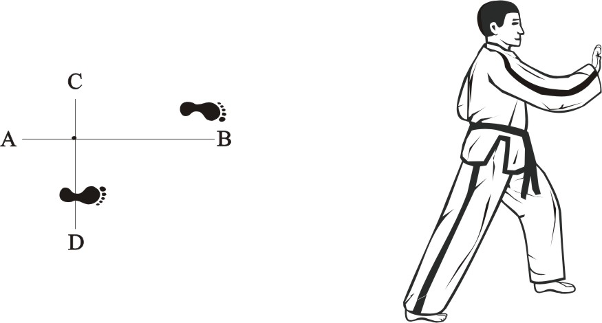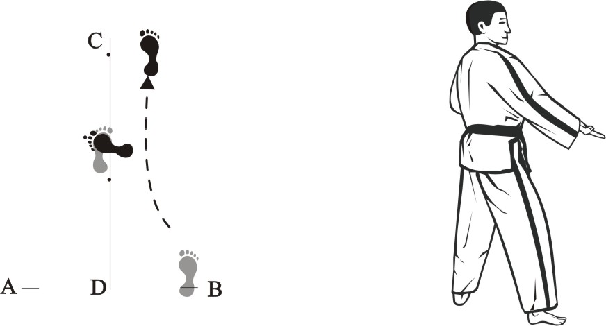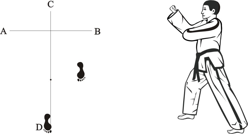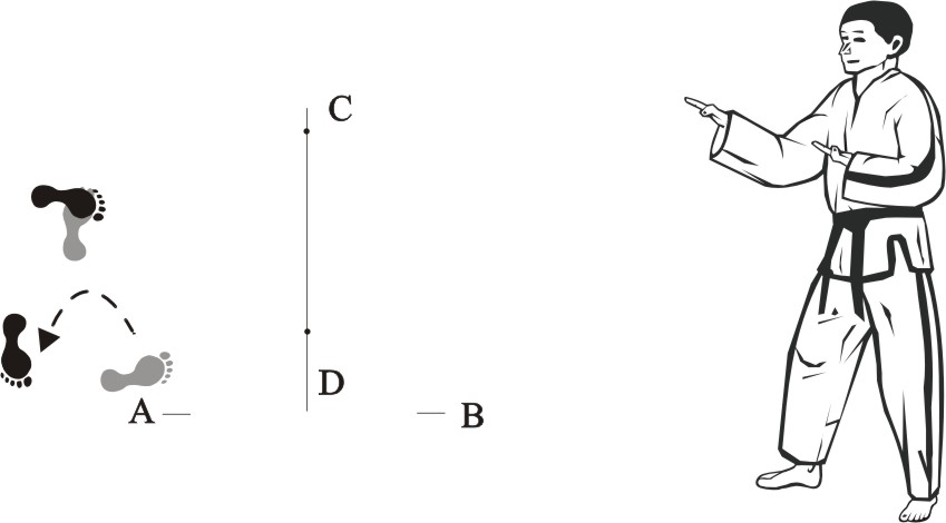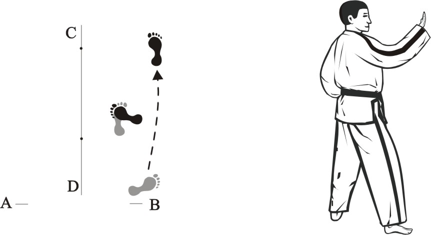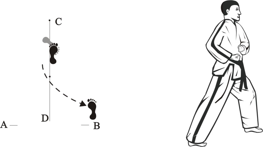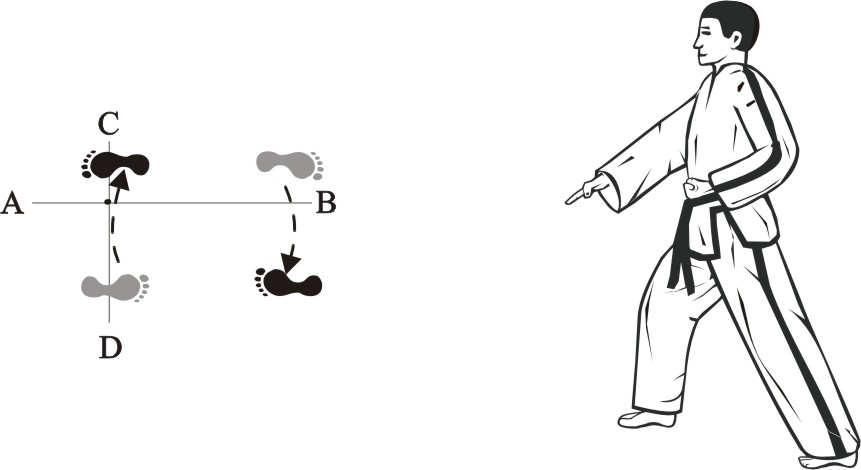 Place the left foot sideways towards D, turn right on the left foot and step forward with the right foot, form a right walking stance towards A and make a right outer knifehand-block low.