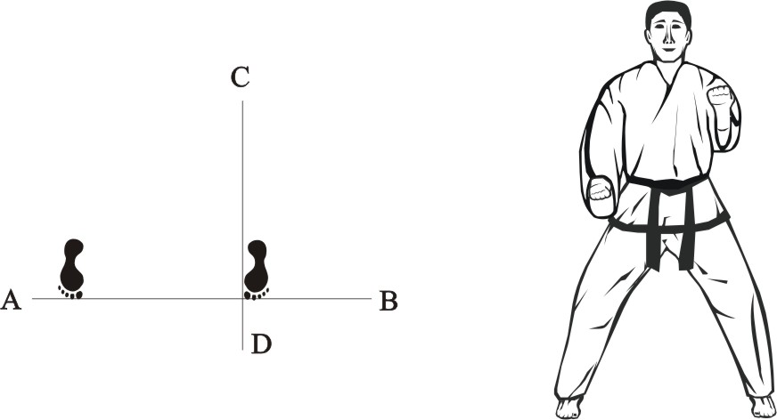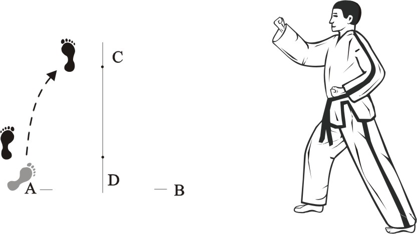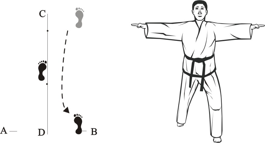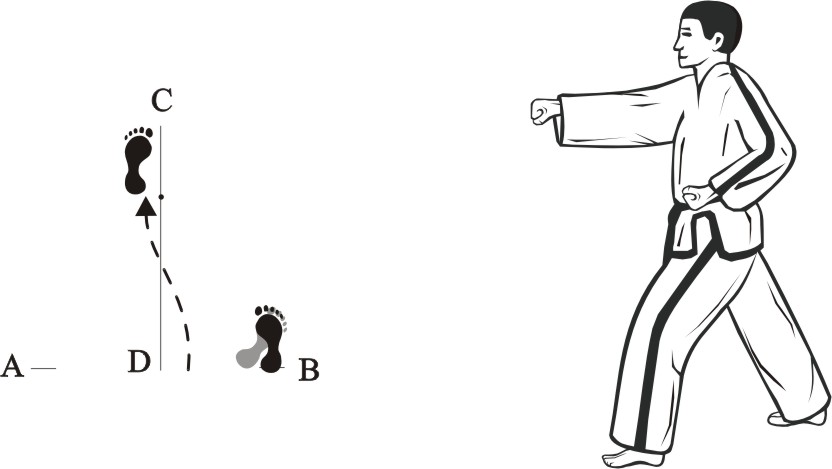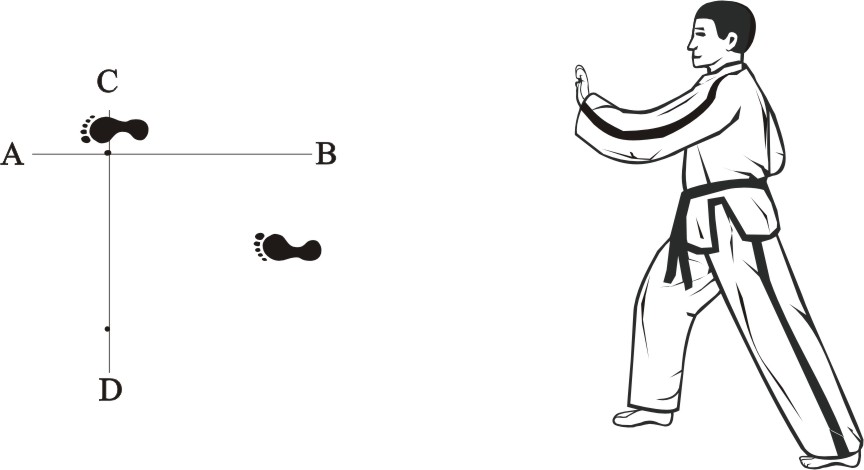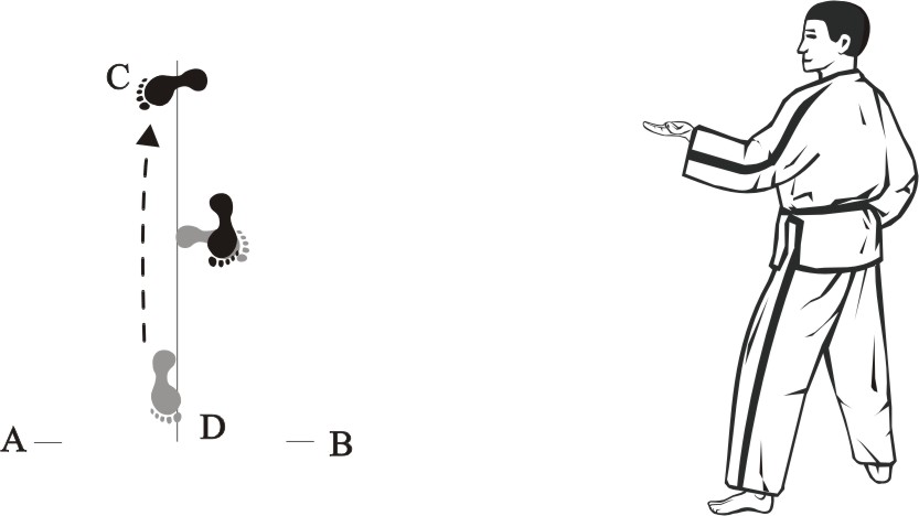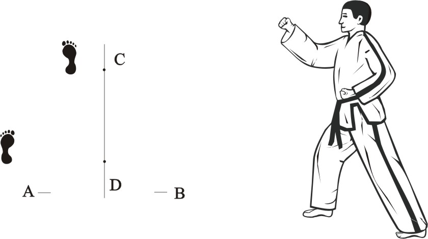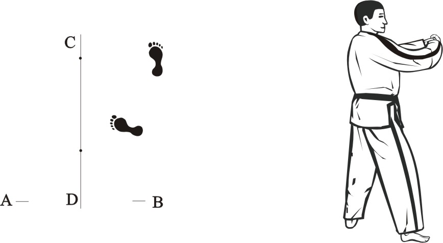 Place the left foot sideways towards D, turn right on the left foot and step forward with the right foot, form a right walking stance towards A and make a right outer knifehand-block low.