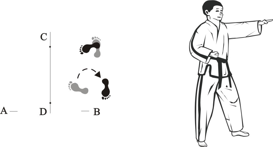 …… turn left on the right foot and make a right side-kick middle towards D.