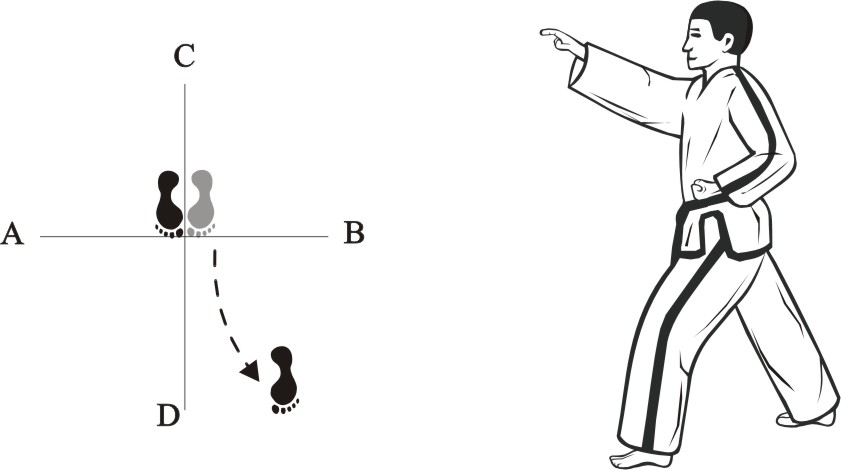 Turn left on the left foot, step back with the right foot towards C and slide towards D, form a right L-stance towards C and make a right side elbow-punch middle.