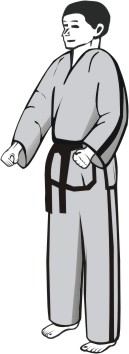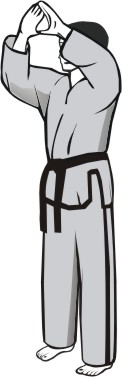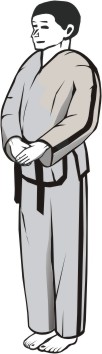 The right fist is held with the back facing down, against the side of the body at the height of the belt. The left hand, shaped like a ‘vertical knife hand’, is pressed with the palm against the front of the right fist. The left arm runs in front of the abdomen.