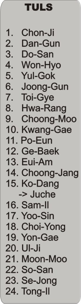 Tuls bear the name of an important person or memorable event in Korea’s history. On the right, the number of positions the Tul has often refers to circumstances of that person or event. It should be noted, however, that the number of positions is sometimes adapted to the symbolic number by combining several techniques in one position.