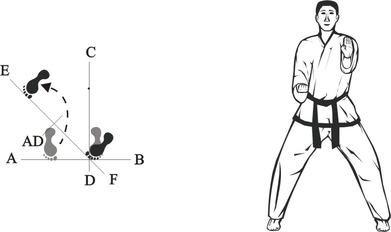 Set the left foot sideways towards B, turn right on the left foot and place the right foot forward, form a right walking stance towards D and make a right outer forearm-block high.