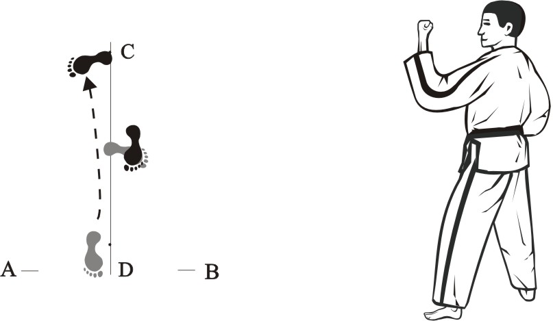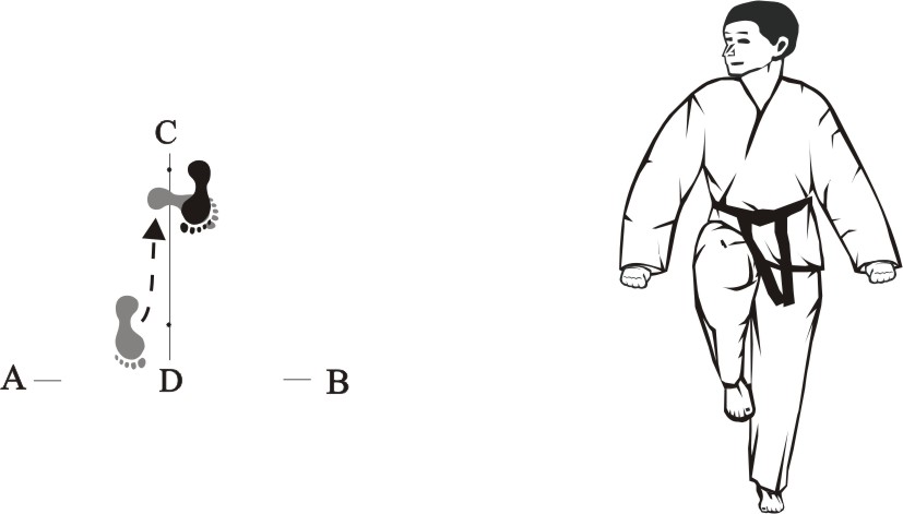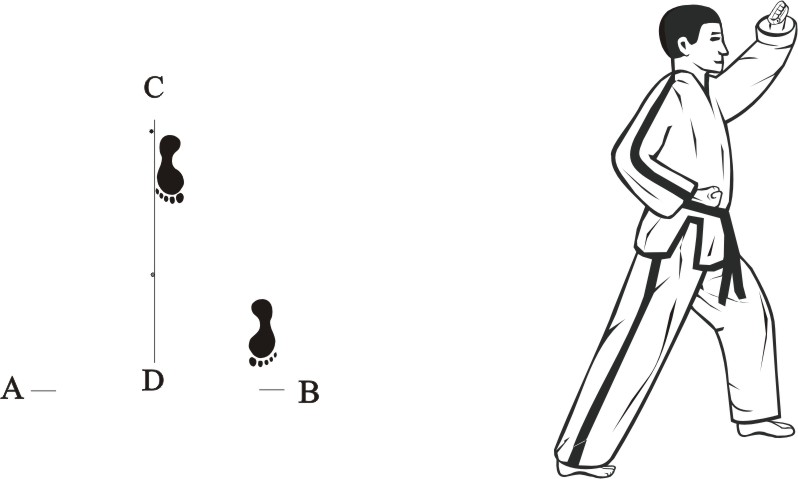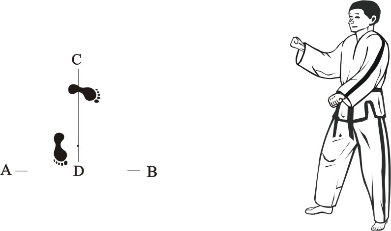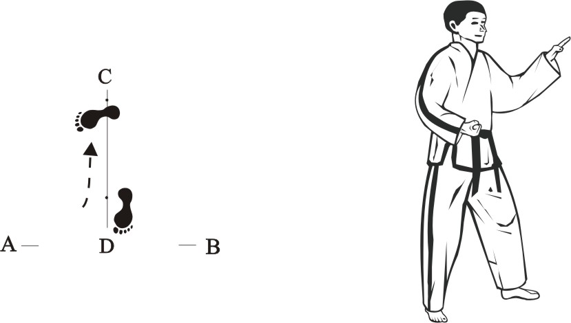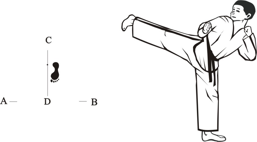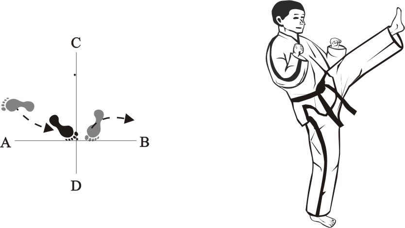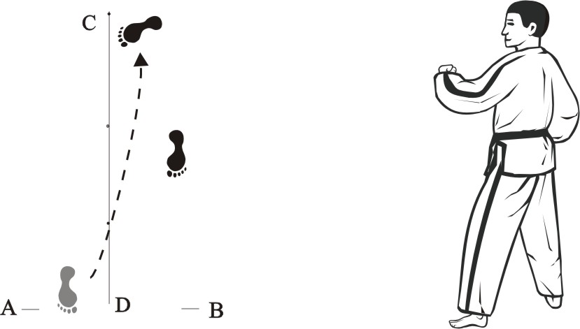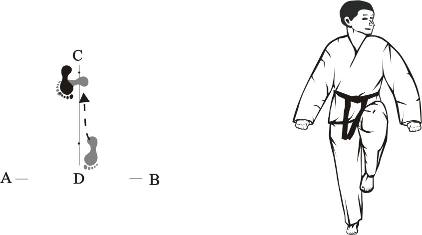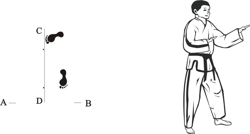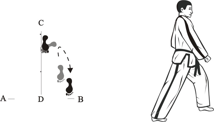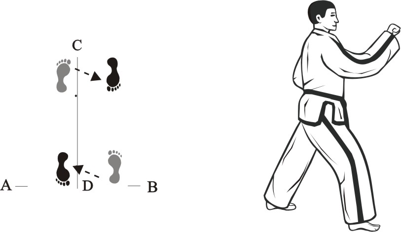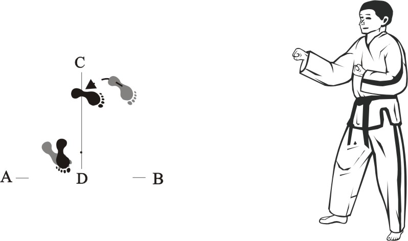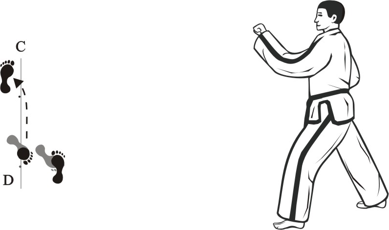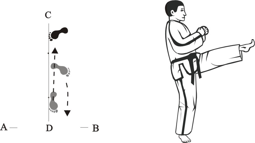 Step back with the right foot towards C and make a left front-kick middle towards D.