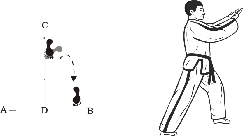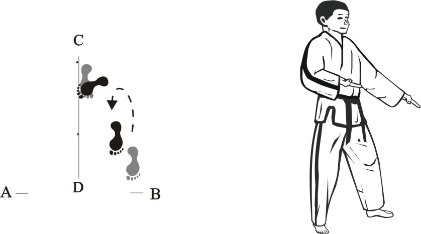 Turn right on the left foot and lift the right foot, assume a left back bending-posture towards C.
