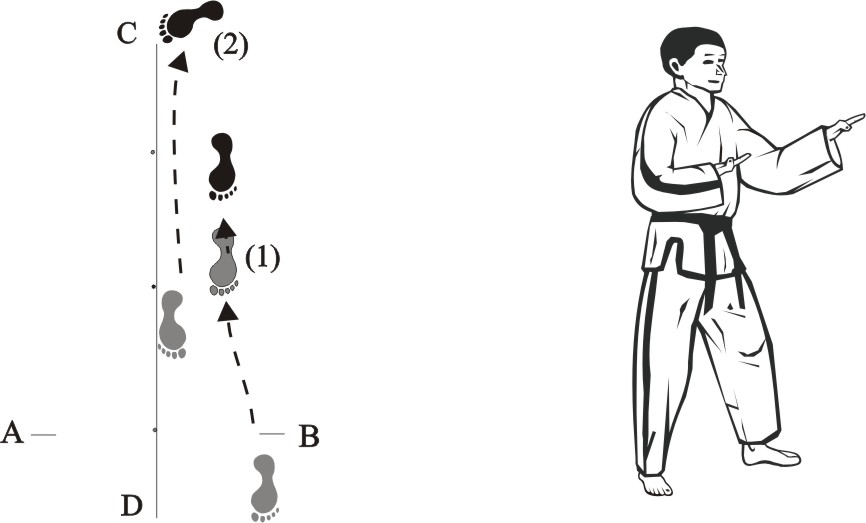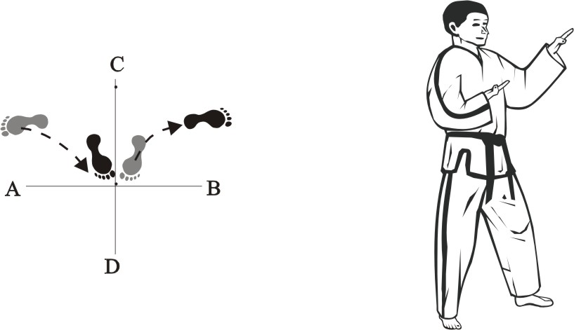 Step with the left foot back towards C (1), then step with the right foot back towards C (2) and then slide back towards C, form a right L-stance towards D and make a guarding knifehand-block middle.