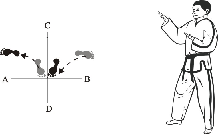 Turn left on the right foot and step forward with the left foot towards D, form a left walking stance towards D and make a twin inward outer knifehand-strike high.