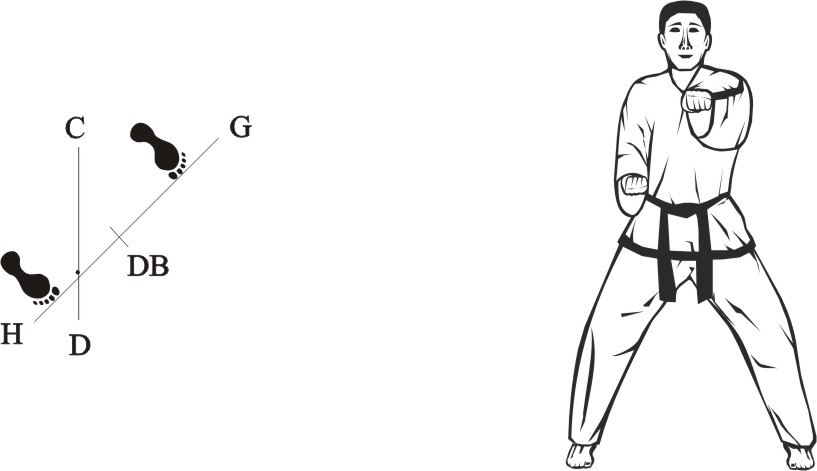 Turn left on the right foot and step sideways with the left foot towards G, form a sitting stance towards DB and make a right forward palm pushing-block middle.