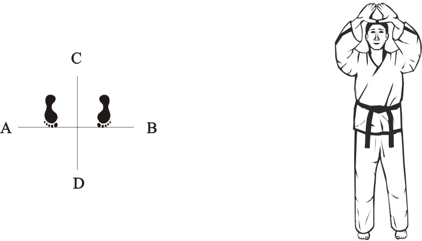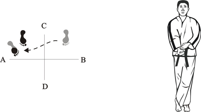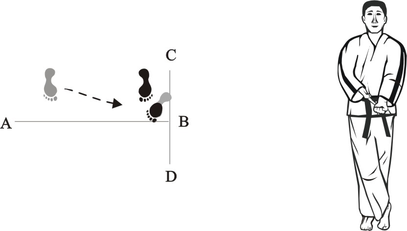 Place the left foot next to the right foot, assume a parallel stance towards D and assume the ready posture Chumby-D.