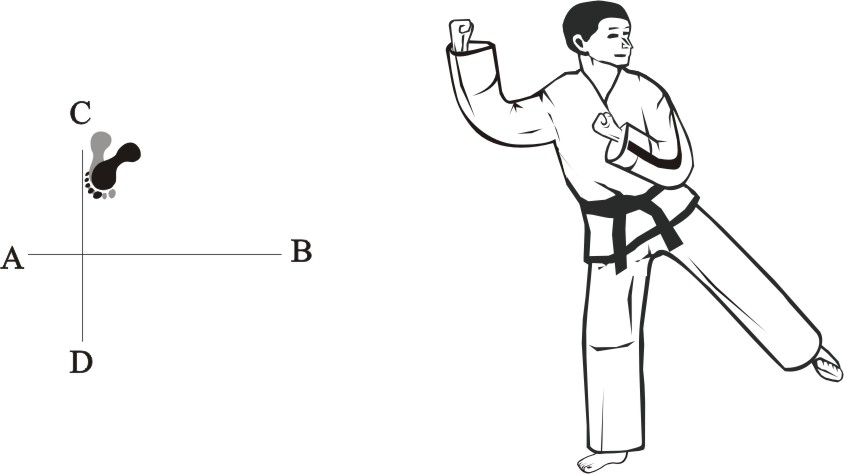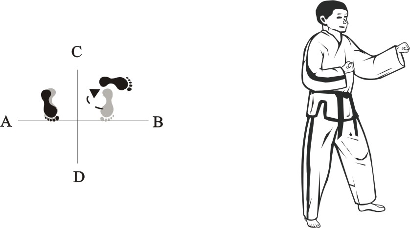 Turn right on the left foot and step with the right foot behind the left foot to the side towards A, form a sitting stance towards D and make a right inner knifehand guarding-block low towards AD.