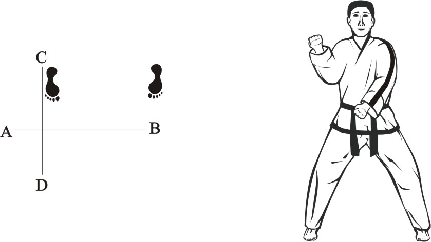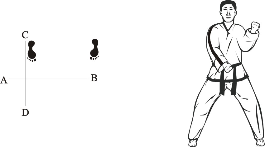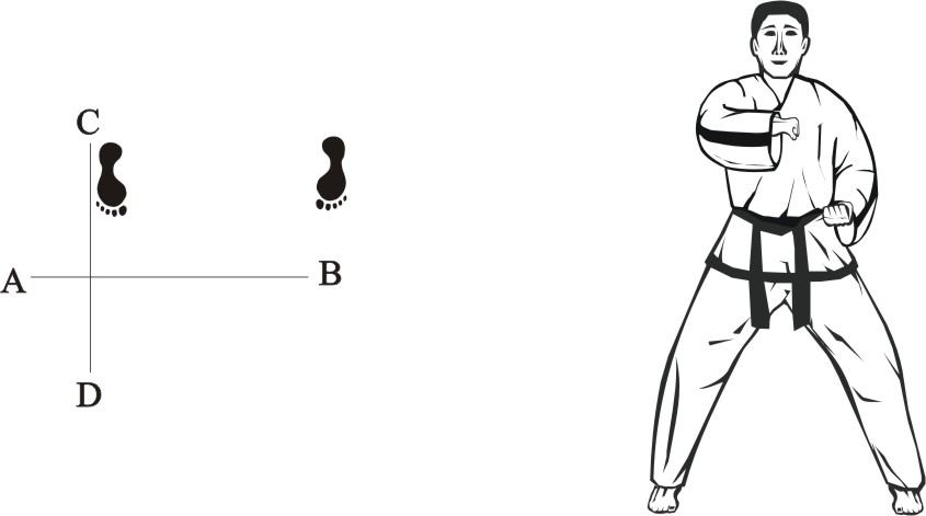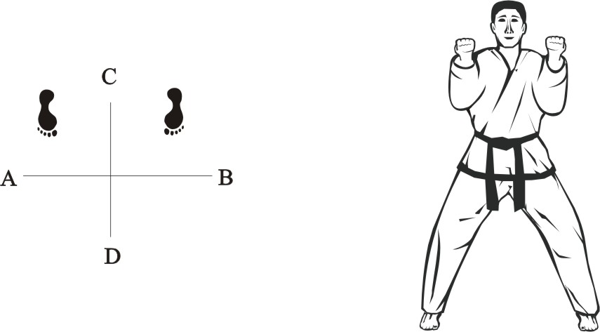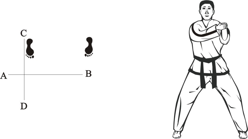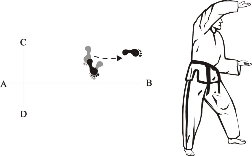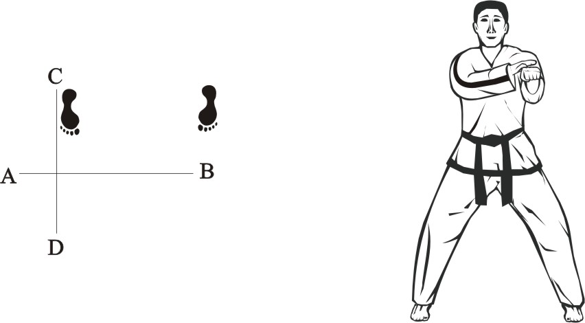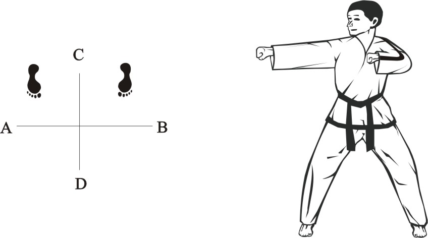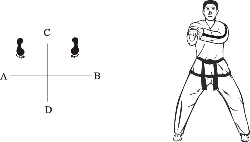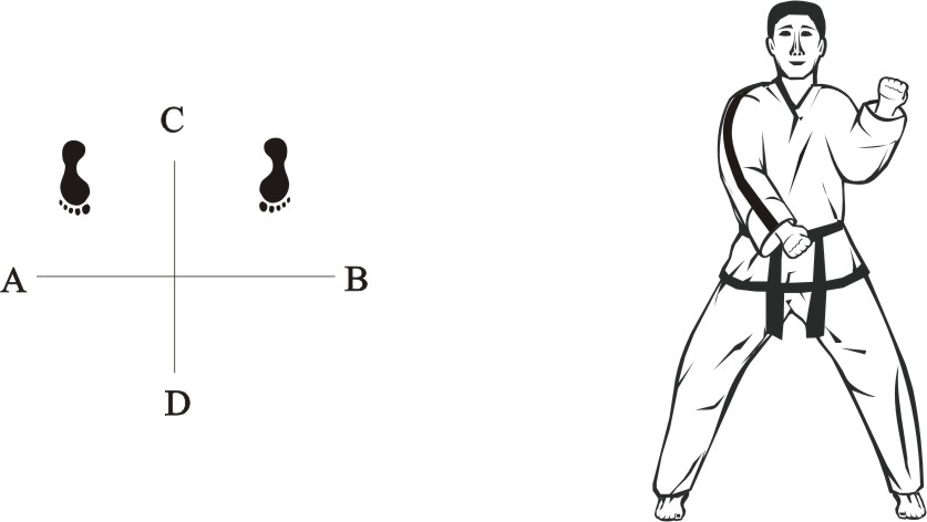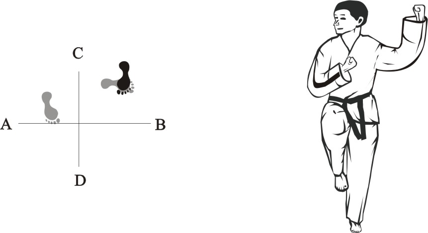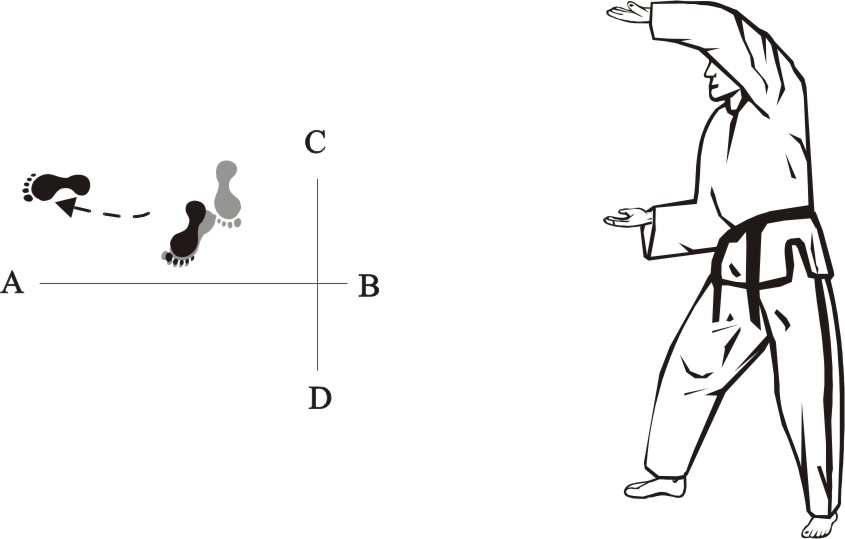 Turn left on the right foot and step with the left foot behind the right foot to the side towards B, form a sitting stance towards D and make a left inner knifehand guarding-block low towards BD.