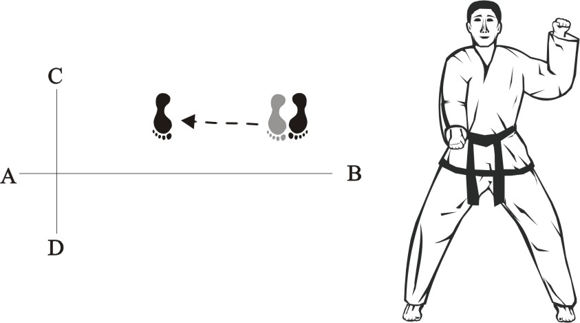 Step with the left foot sideways towards B, form a sitting stance towards D, make a right backward sidefist-strike high and a left checking fist-punch low.
