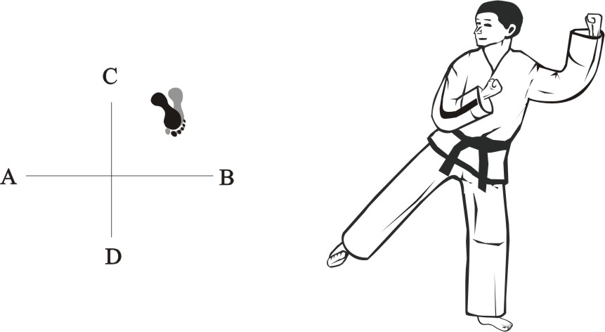 Turn left on the left foot and make a right checking side-kick downward towards A.