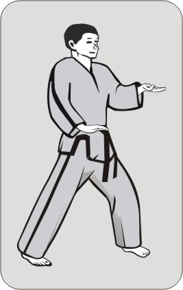 A technique executed at slow speed means creating a technique that extends the time between the start and the contact point. In the Tuls, this is only applied to arm techniques. Taking a stance and bringing the arms to the starting position happens quickly and without haste, just as in a normal ‘fast’ technique. The delay is applied afterward, specifically in the path the arms take to the contact point. A duration of one second is taken to execute this. The counter-movement and twist at the end are also executed with delay. Both arms maintain a constant speed and begin and end simultaneously. The muscles are consistently tightened to about 80% of what would be maximum possible and relax after the contact point. An extended exhalation is applied. The exhalation lasts as long as the execution of the technique.