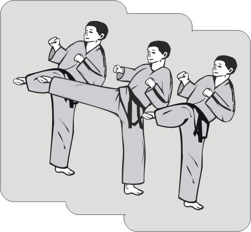 During leg techniques, the kickingleg is lifted at normal speed. Then, the leg extends to the contact point in slow motion, i.e., in 3 seconds. The kikcing leg is then brought back at normal speed.