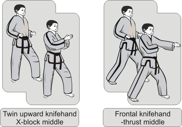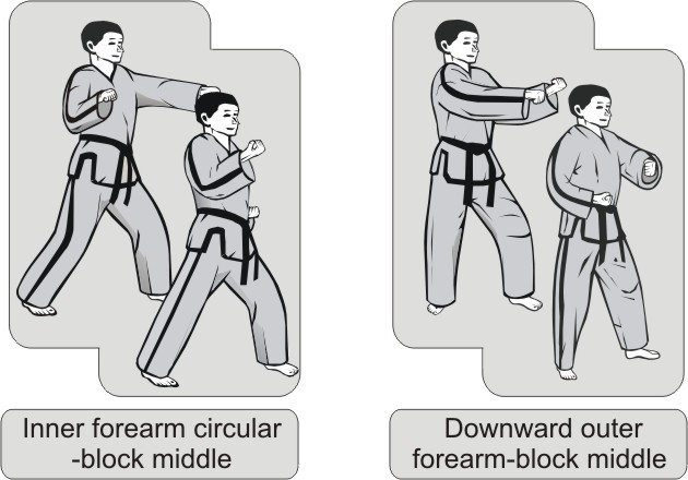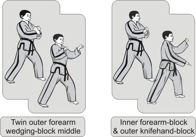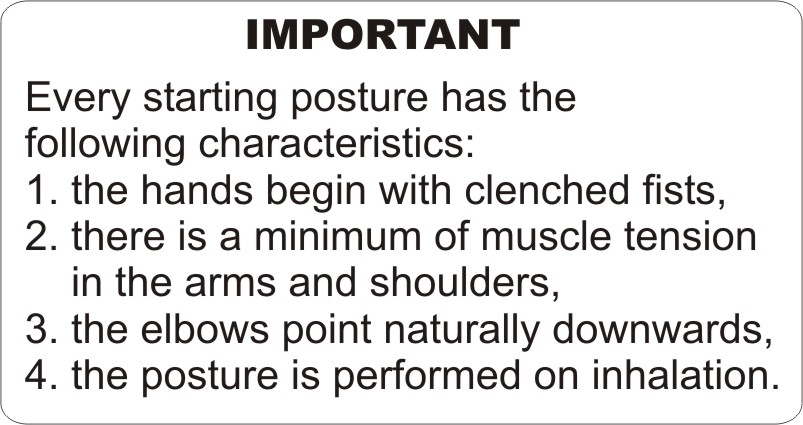 In the parallel starting posture, the forearms are parallel to each other. From this position, both arms can perform a technique, or one arm is for the technique while the other makes the counter-movement. There are three height variations for the fists: low (next to the band), middle, and high.