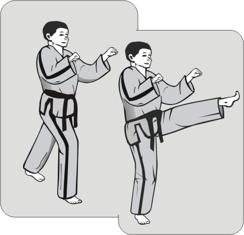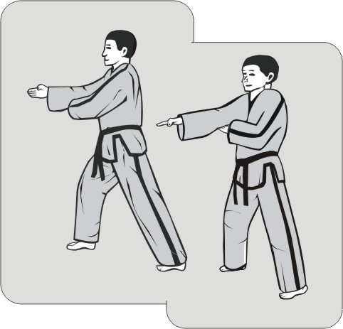 This technique is executed forcefully on the ‘inhalation’ with a delayed speed. The subsequent technique goes directly on the exhalation. The opponent is stopped and is immediately attacked with a counter-offensive.