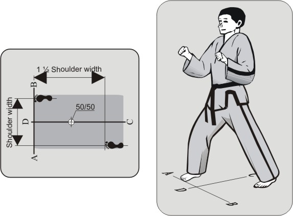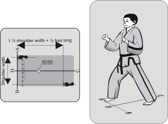 In this stance, both feet stand straight forward, parallel to the CD line. One leg is in front and one behind. The back leg is extended. The front leg is bent and stands with the knee straight above the ankle. The upper body is parallel to the AB line.